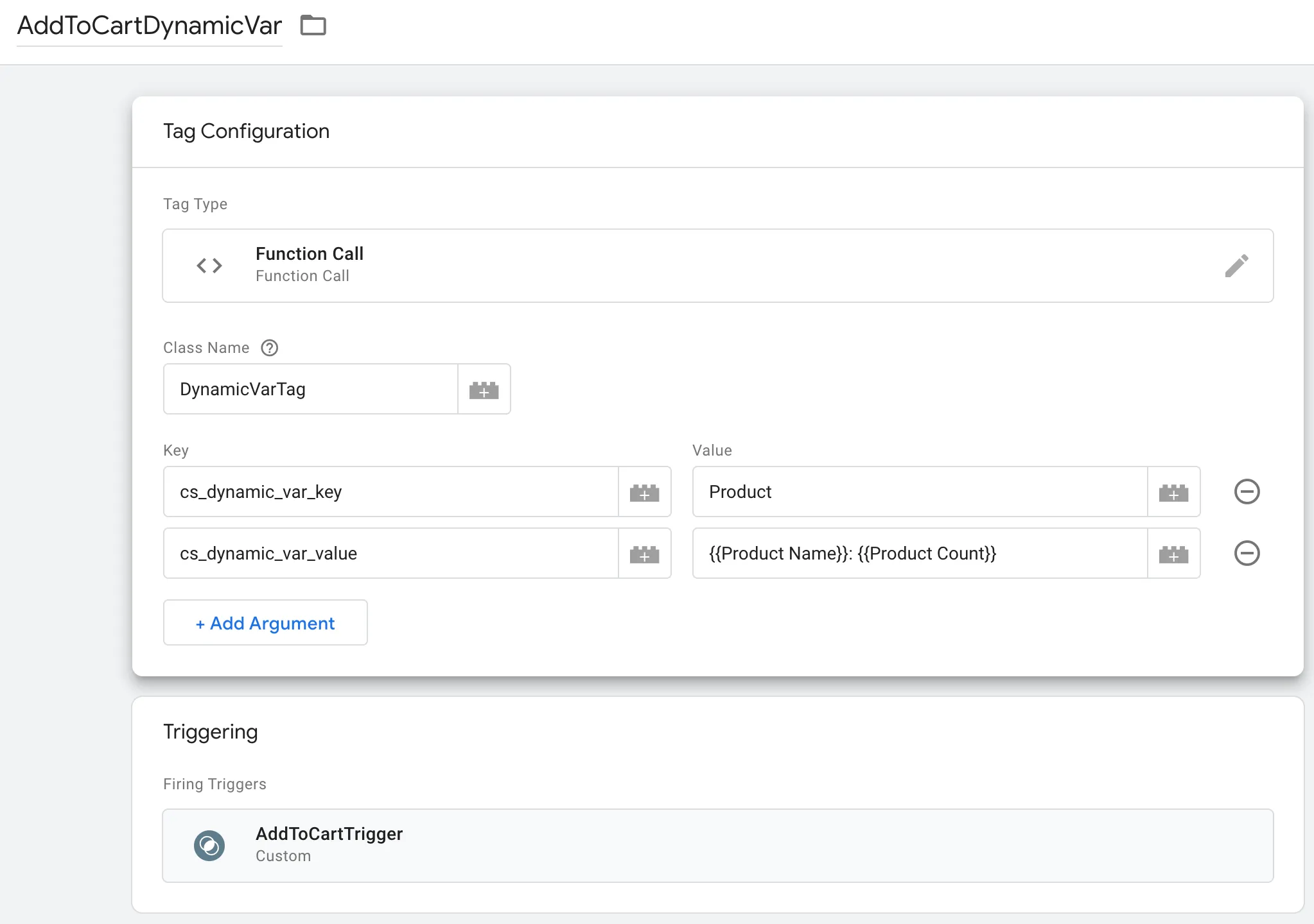 Key: cs_dynamic_var_key, Value: Product,Key: cs_dynamic_var_value, Value: {{Product Name}}: {{Product Count}} - The Triggering set to AddToCartTrigger