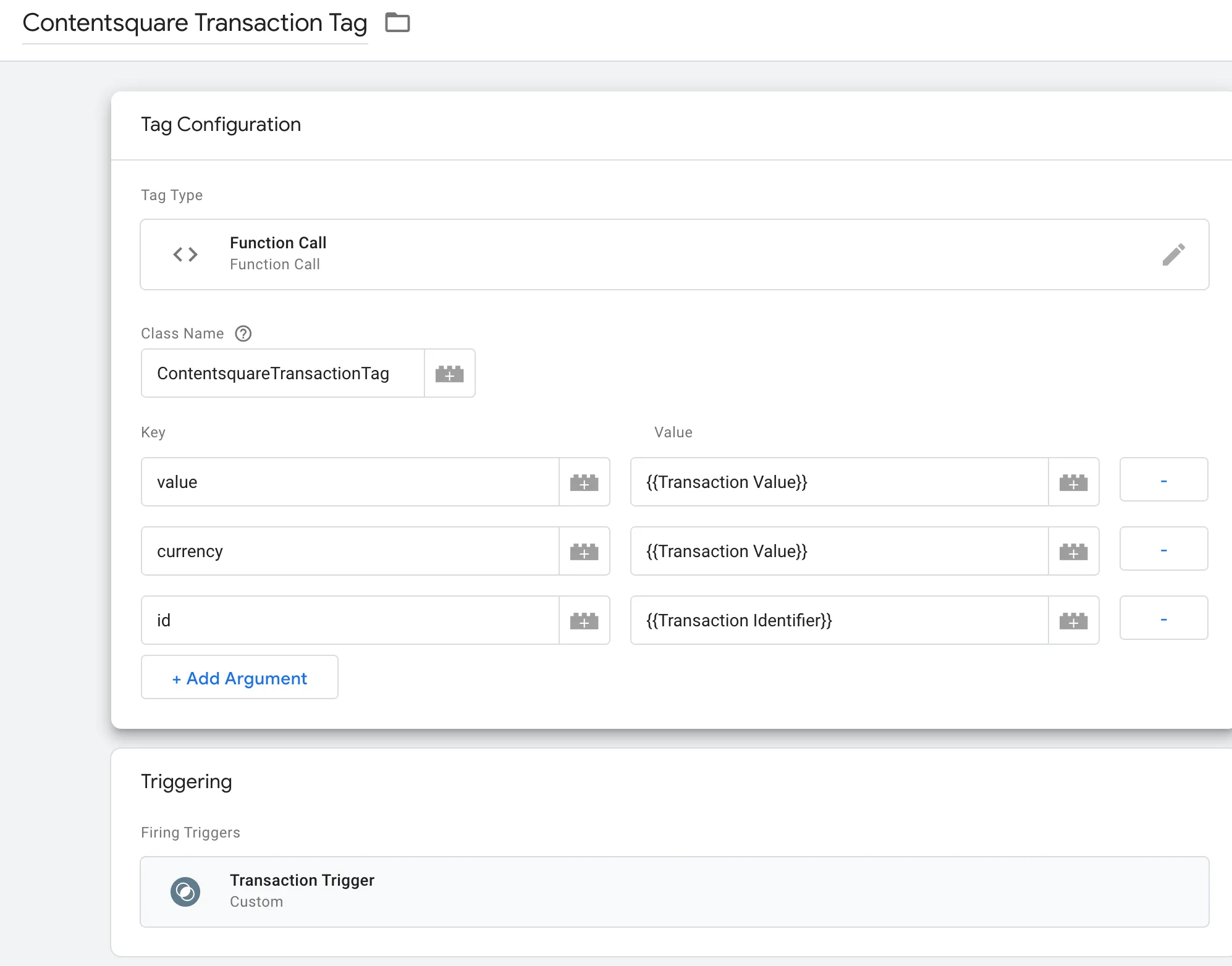 Create a Function call Tag called ContentsquareTransactionTag, pass the two to three variables created earlier as arguments (skip the id line if you do not want to use it) and set its trigger to the one you just created.