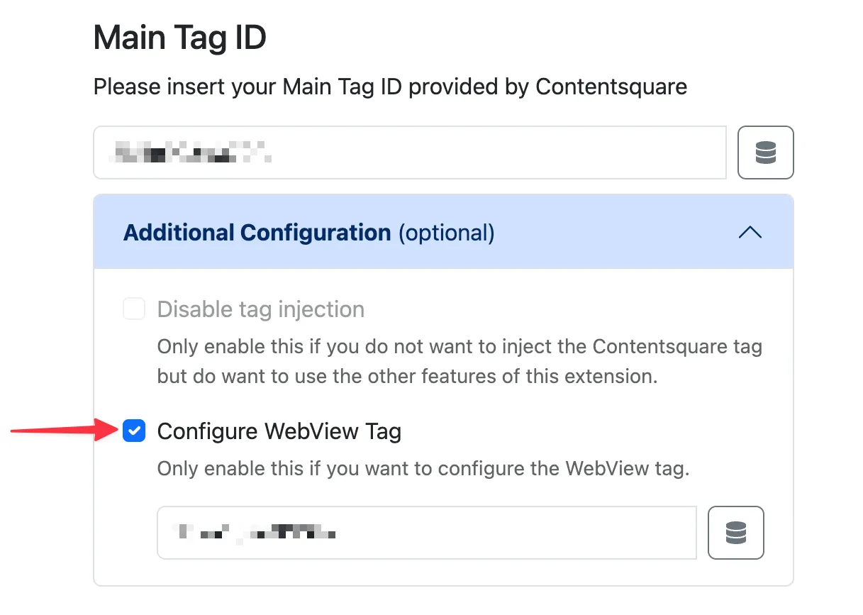 If you want to have your WebView tag automatically injected when in WebView mode, expand the Additional Configuration section, select the Configure WebView Tag checkbox and insert your WebView Tag ID (provided by Contentsquare).