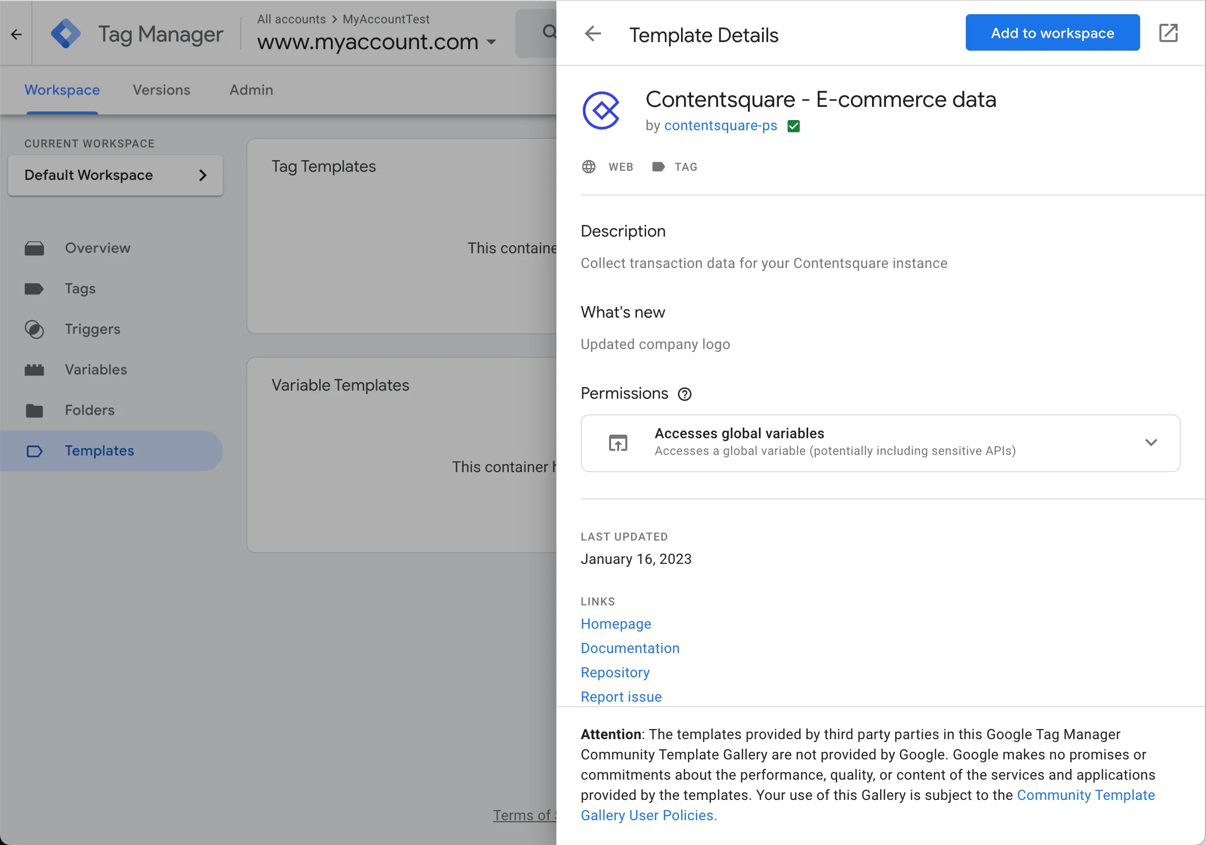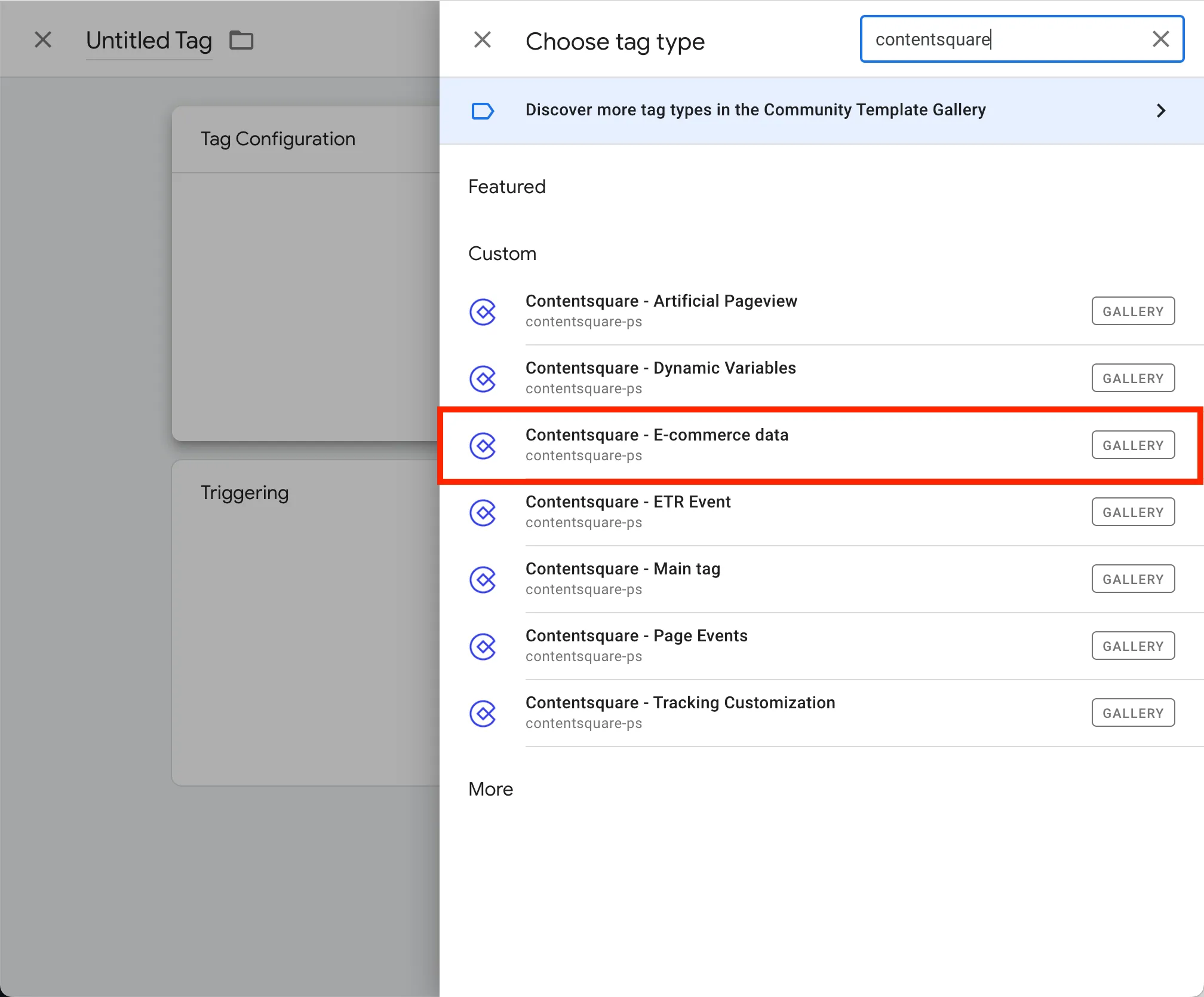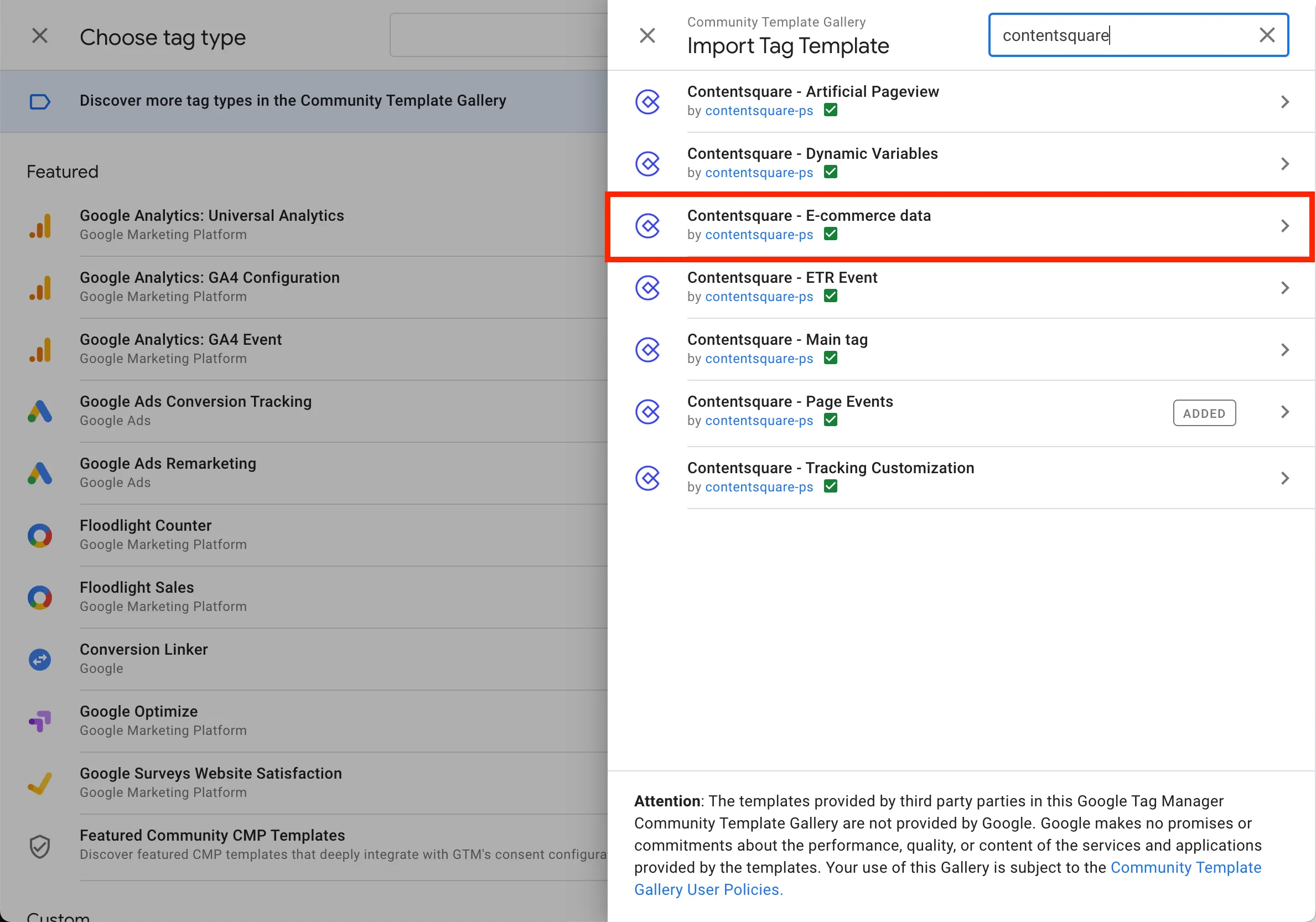 contentsquareand select the Contentsquare - E-commerce data template that you’ve previously added to your container.