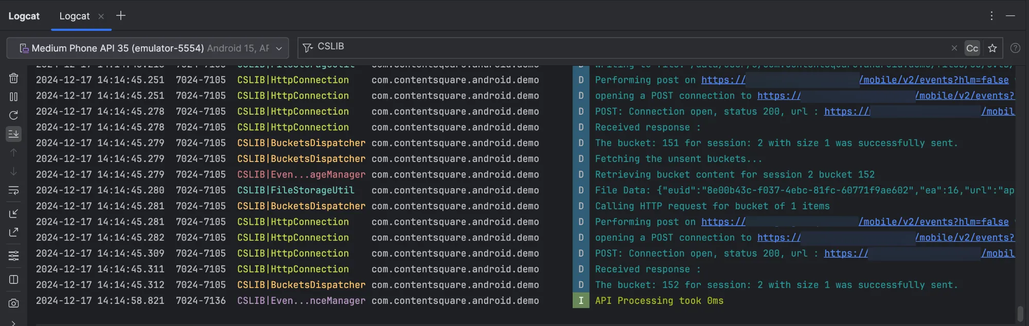 Section titled Check the logsContentsquare provides logging capabilities that allow you to inspect the raw event data logged by your app in Android Studio, or on the Contentsquare platform.