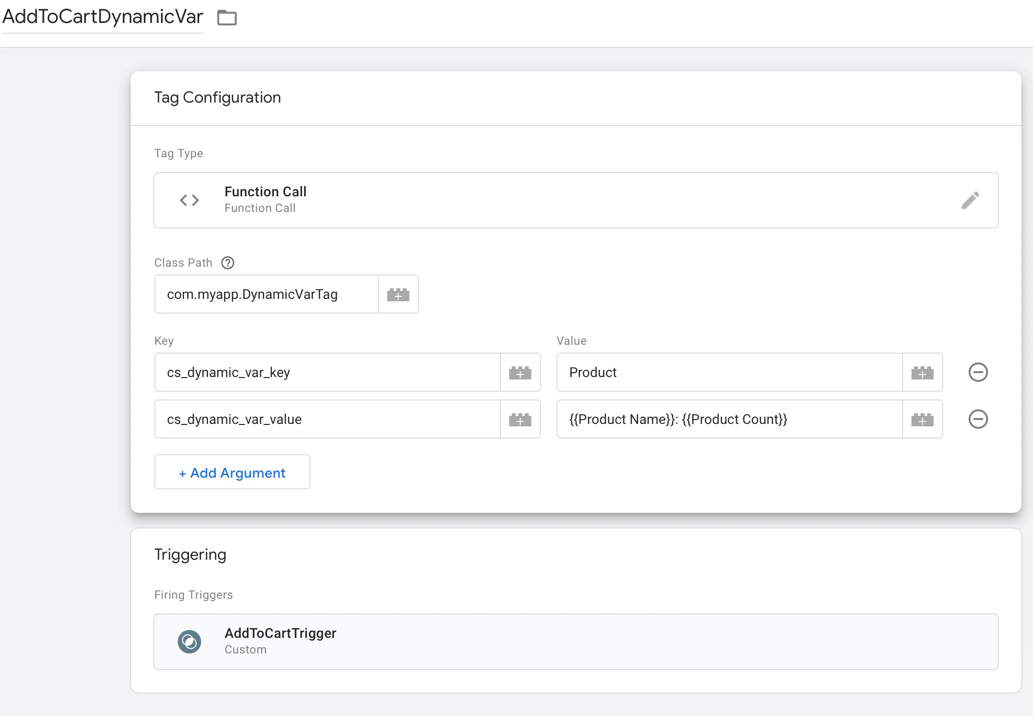 Section titled Create the custom function TagWe need to create a function tag AddToCartDynamicVar