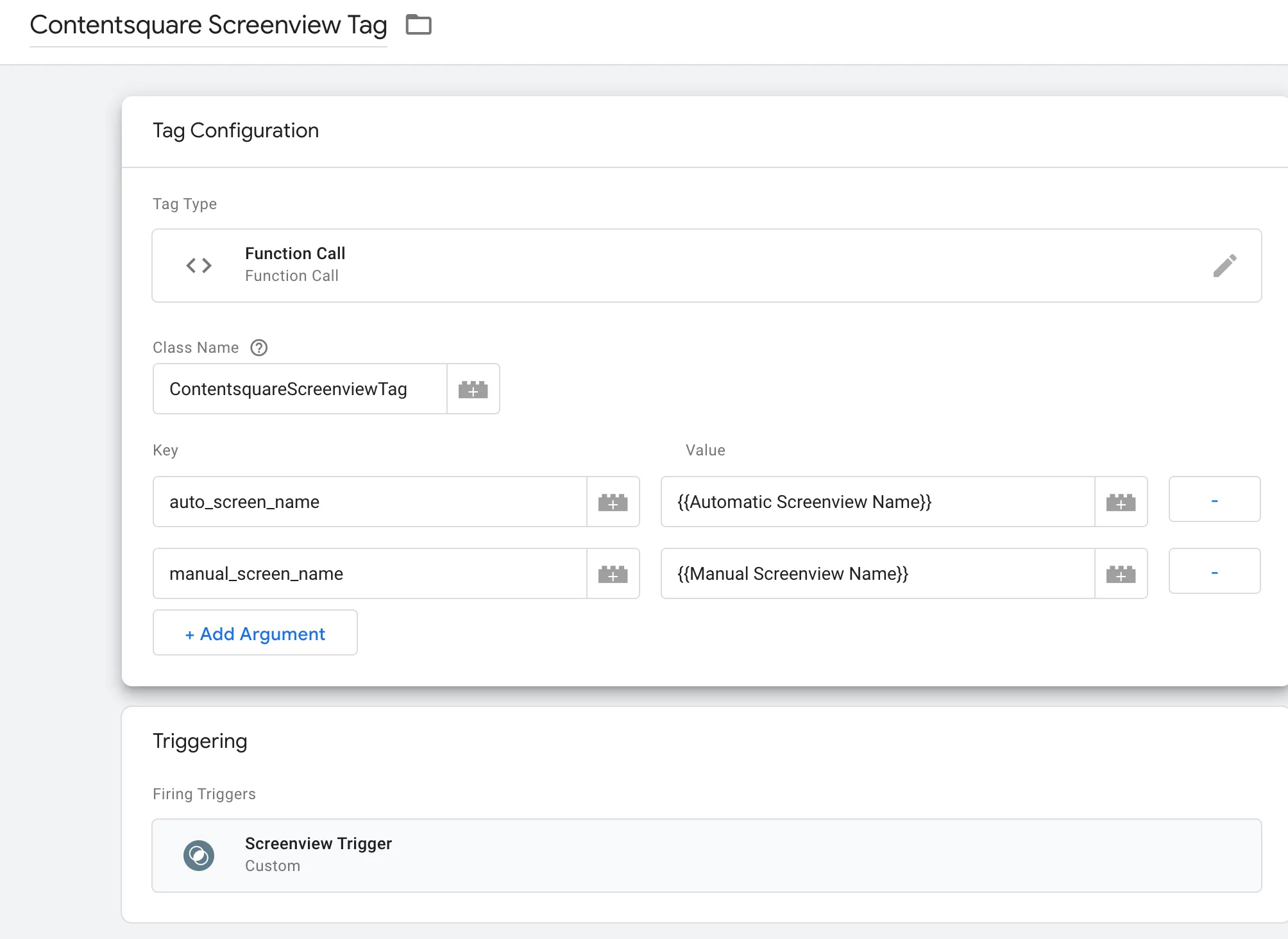 auto_screen_nameand the variable{{Automatic Screenview Name}}as the value - Add an argument with the key