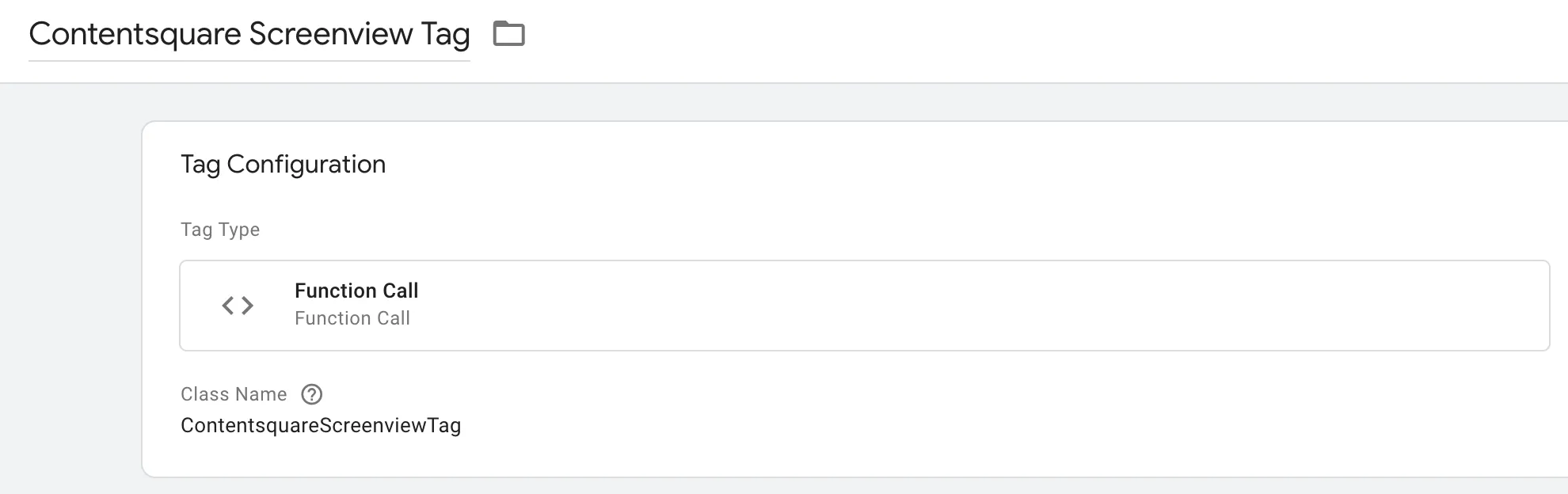 Section titled Create the custom function Tag classIn your app code, create a class of the same name as the Class Path you configured in the GTM interface, for example ContentsquareScreenviewTag. This is how GTM connects the configuration and the actual class to trigger. This class is used to call the Contentsquare screenview tracking function as follows: