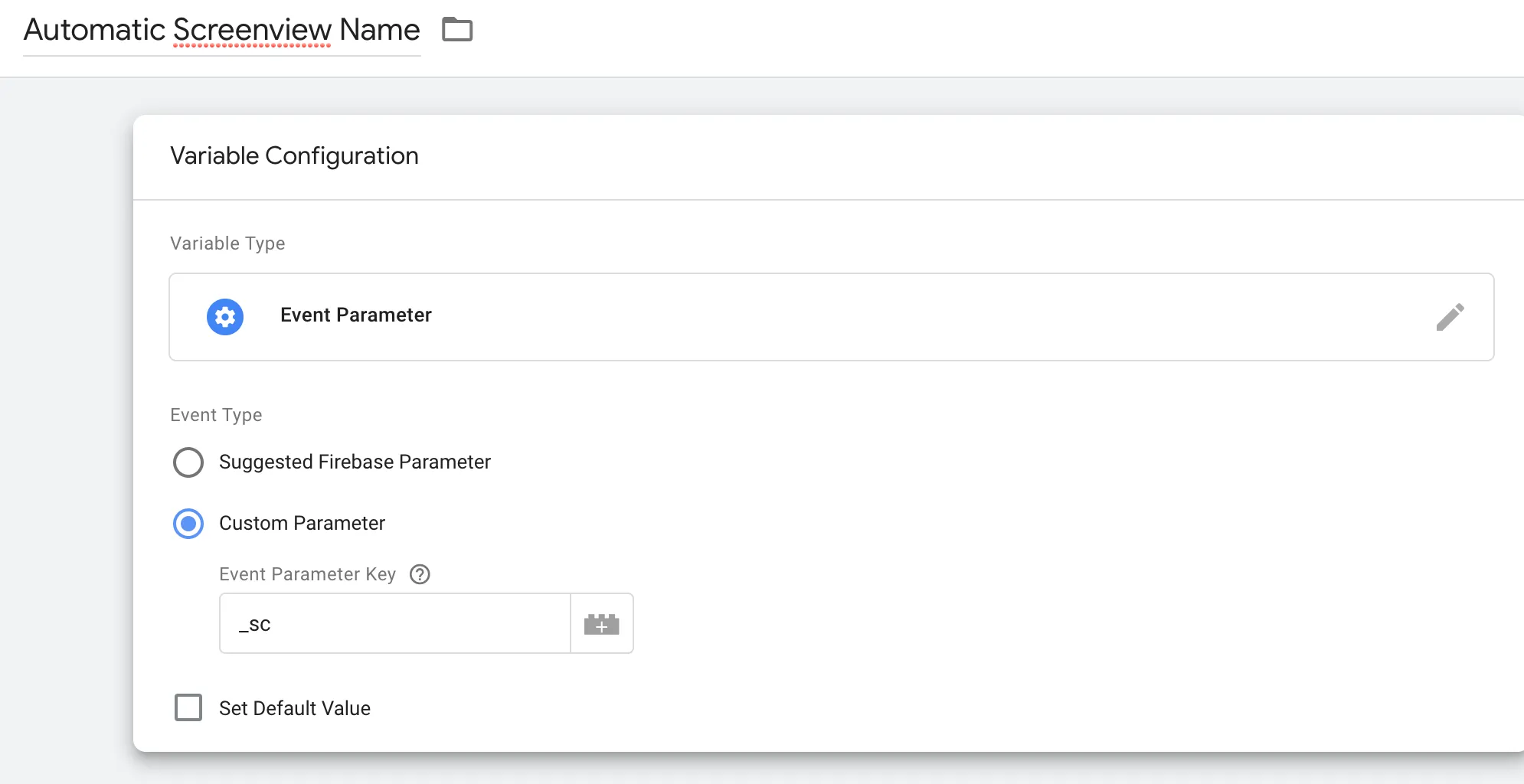 Section titled 1. Variable for automatically tracked screensFirebase’s screen_view events have an _sc parameter (for screen class) which we can use as parameter for screens that are automatically tracked.