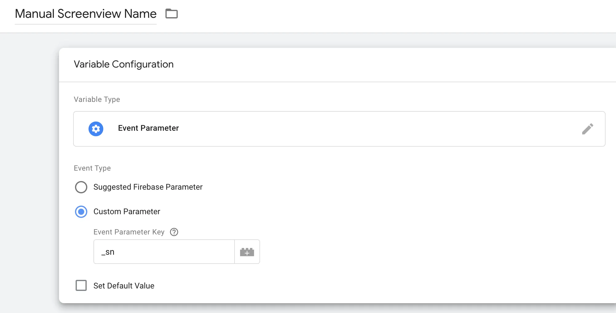 Section titled 2. Variable for manually tracked screensFirebase’s screen_view events have a _sn parameter (for screen name) which we can use as parameter for screens that are manually tracked.