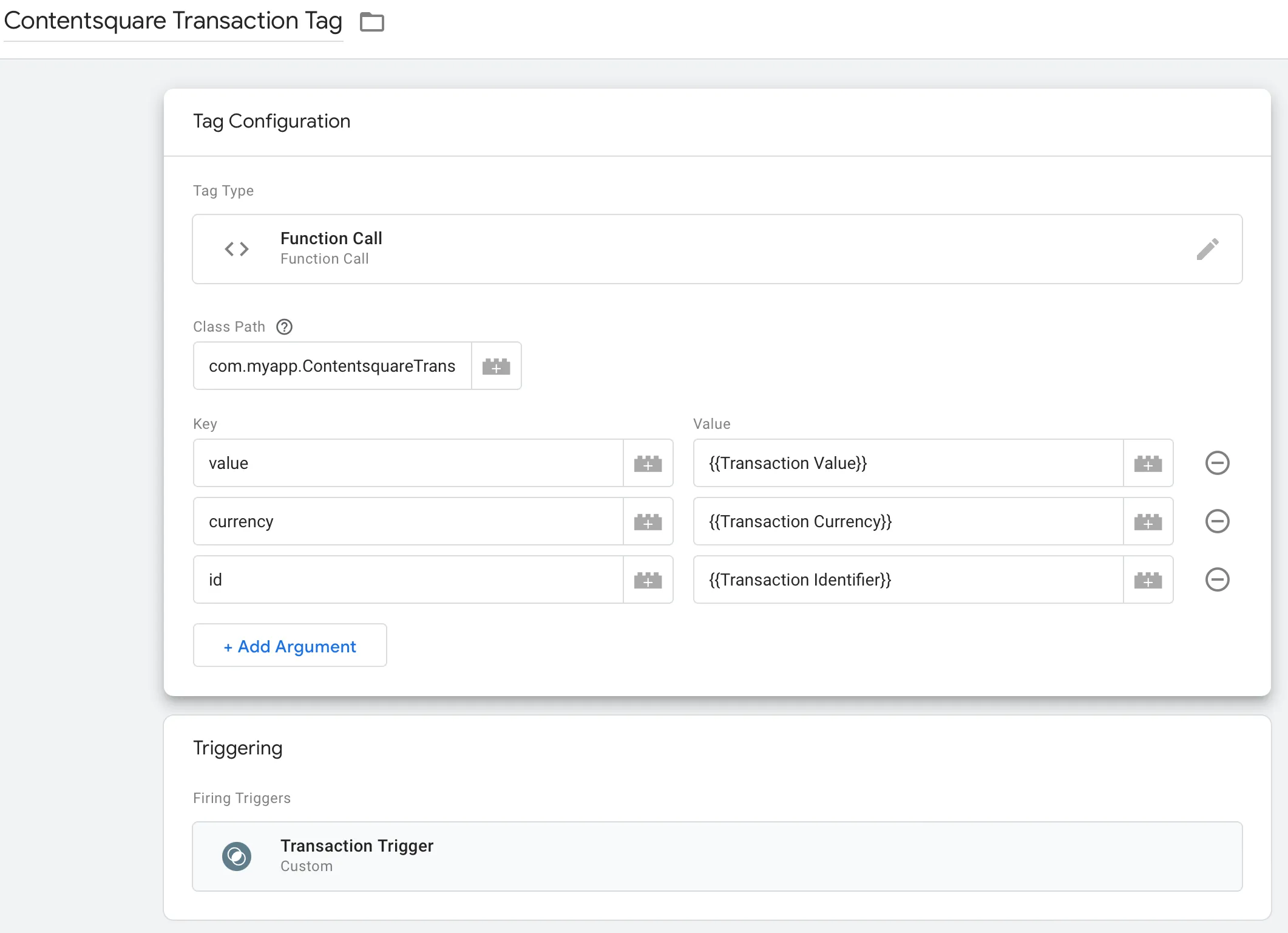 Section titled Implementing the function callWe need to create a ContentsquareTransactionTag class, and have it adhere to the CustomTagProvider interface to link it to the Google Tag Manager custom Tag of the same name.
