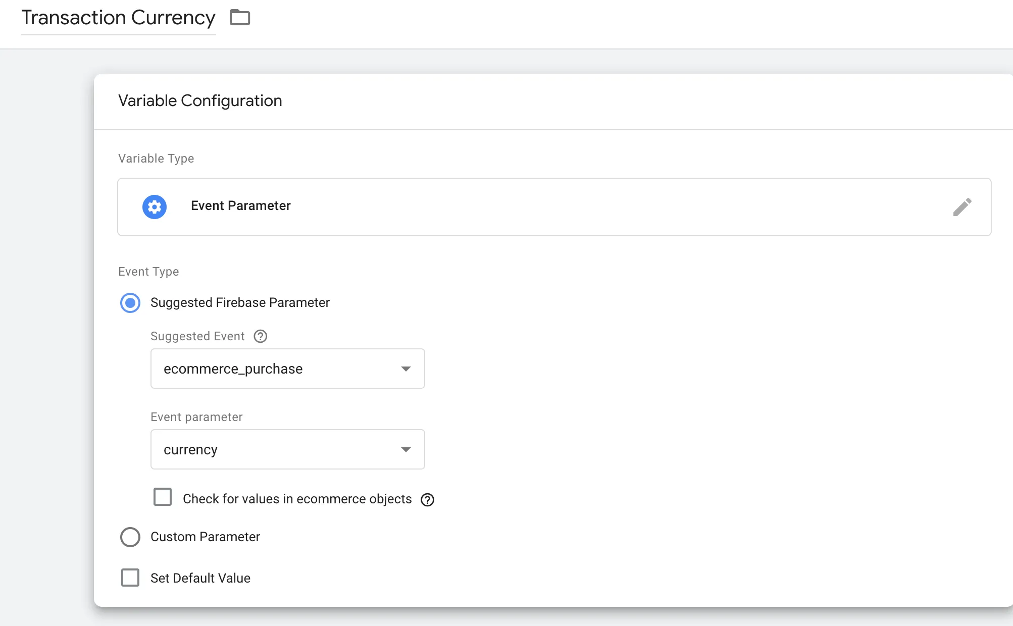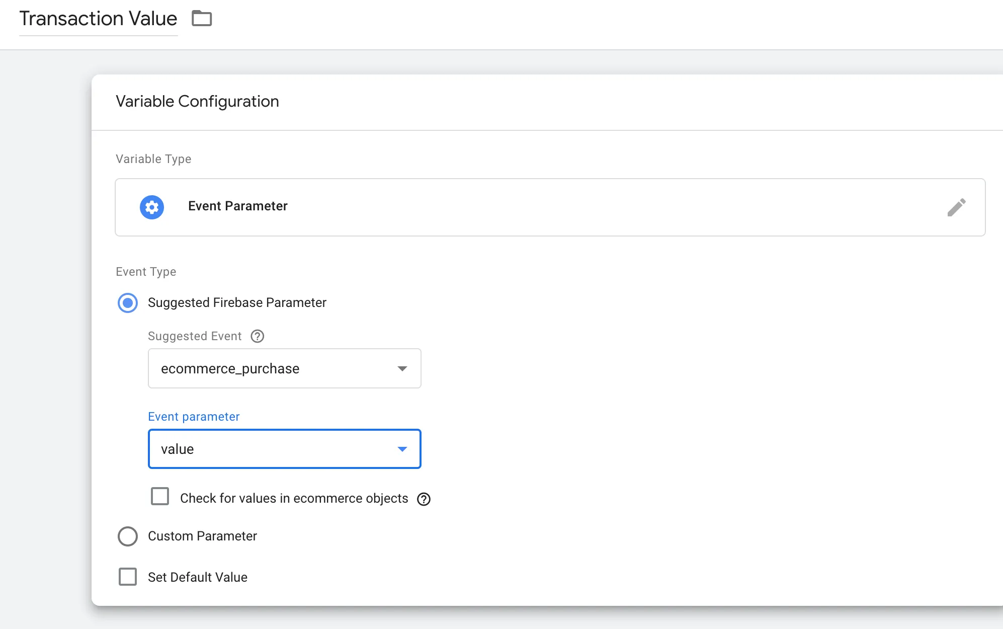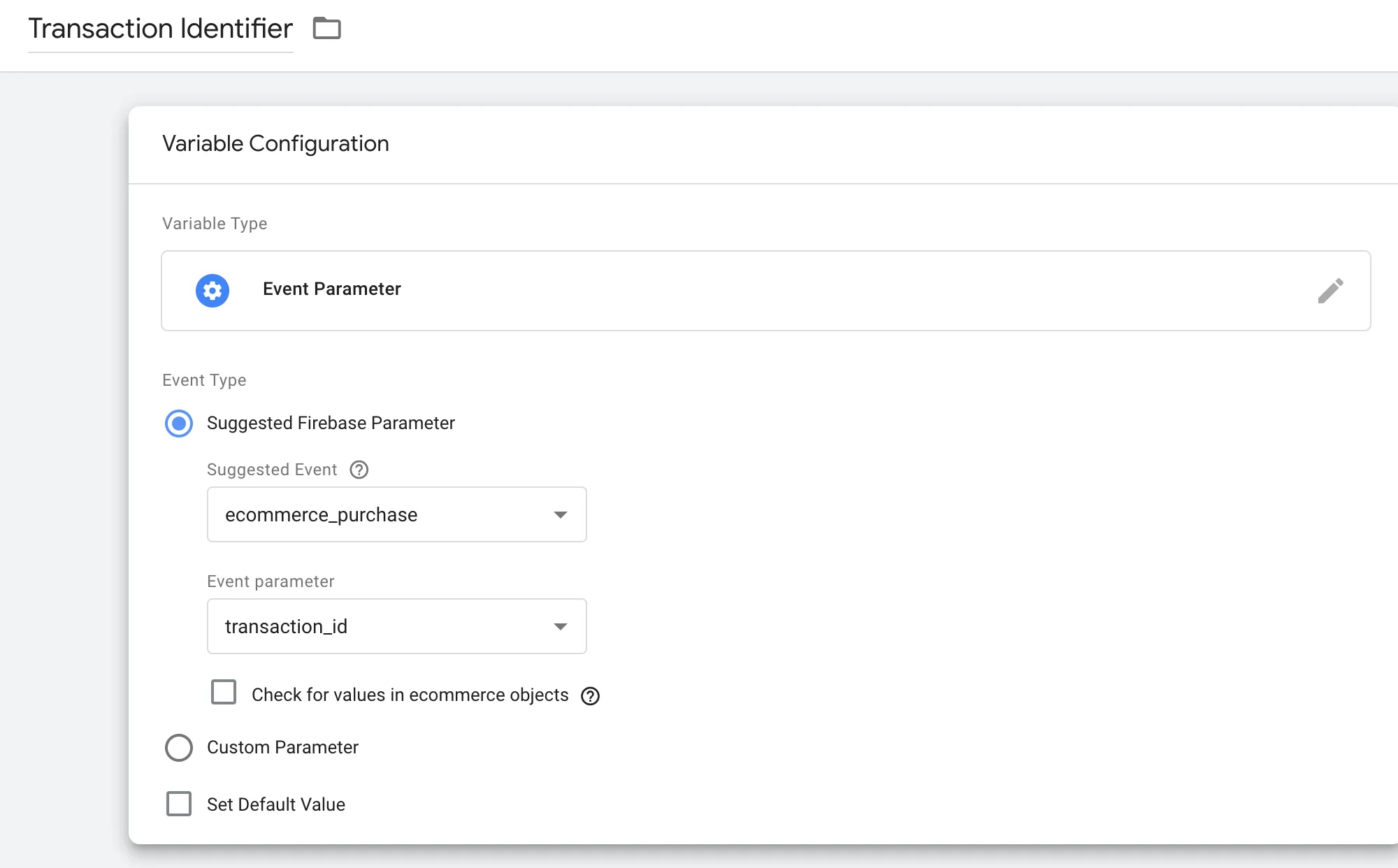 Section titled VariablesWe have to create at least two variables in order to be able to build a transaction event: Value and Currency. Optionally, it is also possible to pass a transaction identifier, meaning you would need to create an additional variable in order to be able to use it.