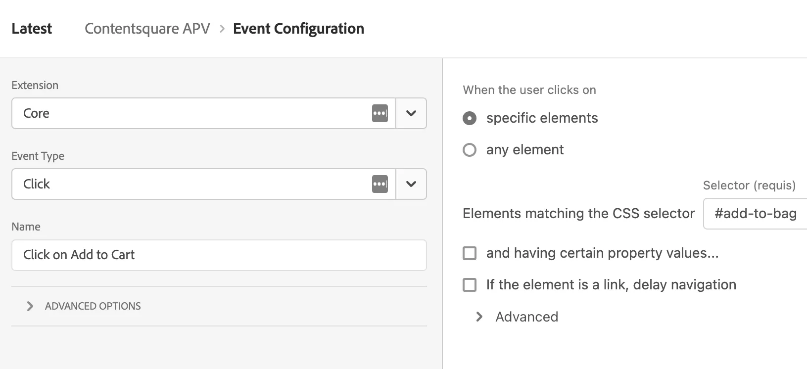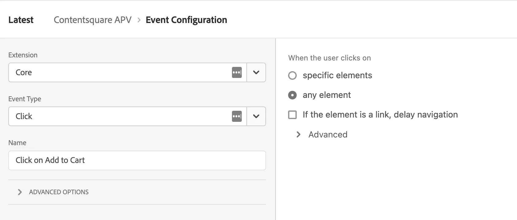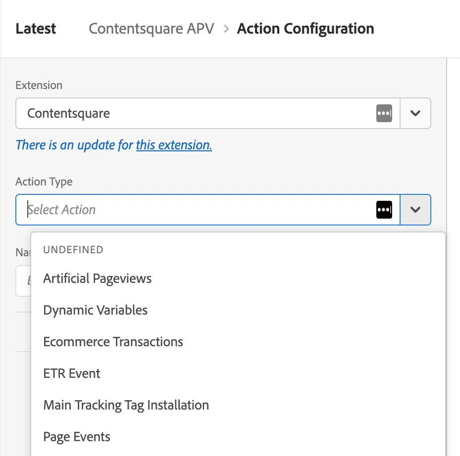 Une fois que vous avez choisi l’événement souhaité, vous pouvez sélectionner l’action de suivi de vue de page artificielle à partir de l’extension Contentsquare.