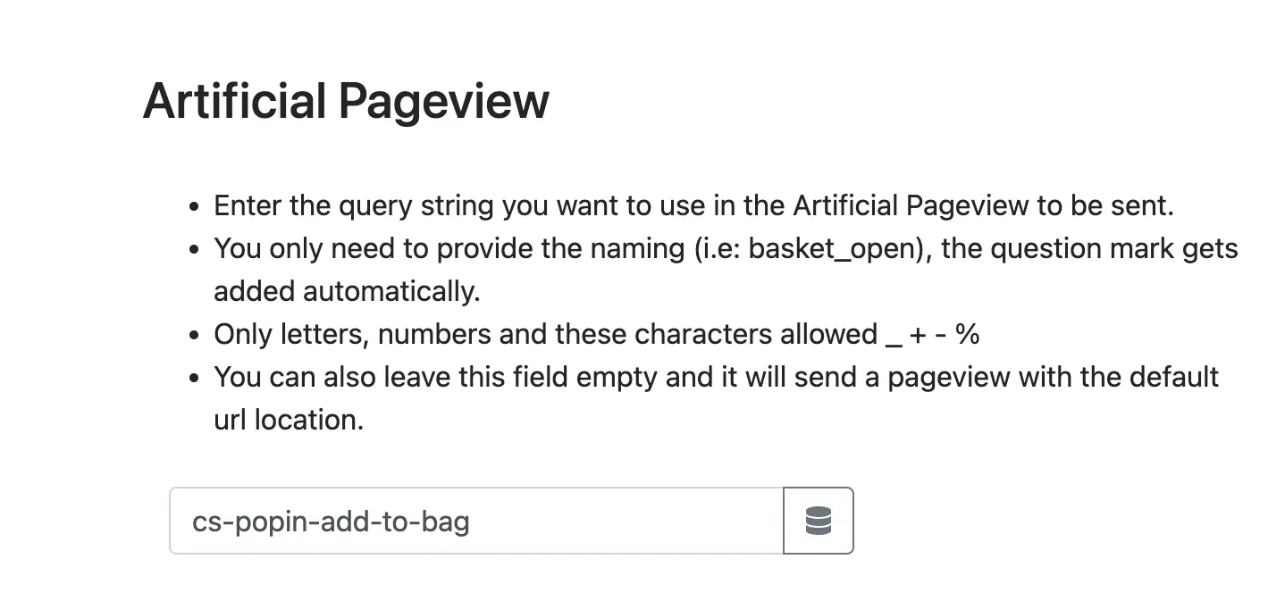 Artificial Pageview value. - Si une fenêtre modale (parfois appelée “popup”) et que vous devez déployer les pageviews artificielles, sélectionnez
