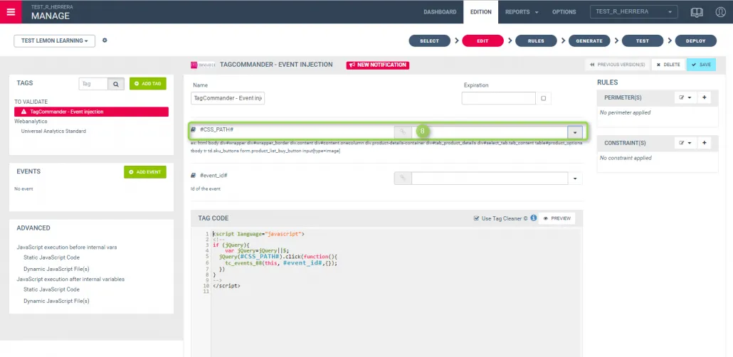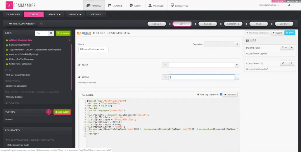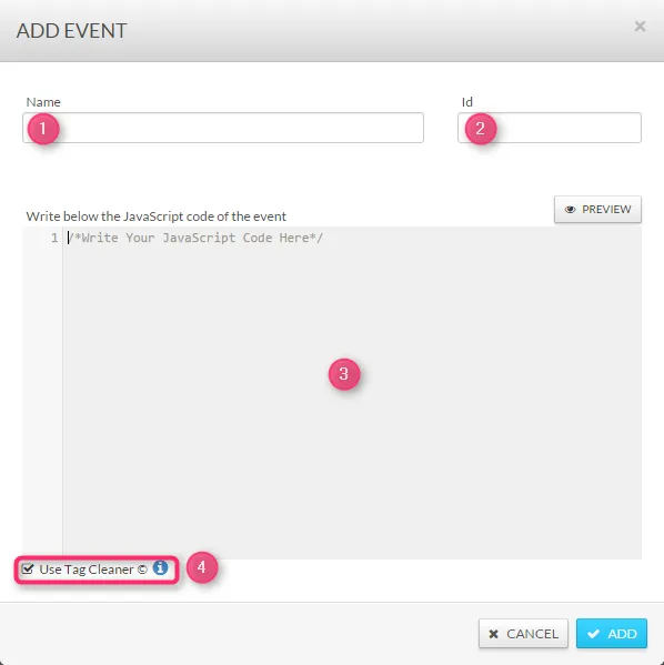 - (4) «Utiliser le nettoyeur de balises» : fonctionnalité permettant de «corriger» l’événement (le réécrit afin d’éviter les erreurs JavaScript et le rendre compatible avec le code du conteneur).