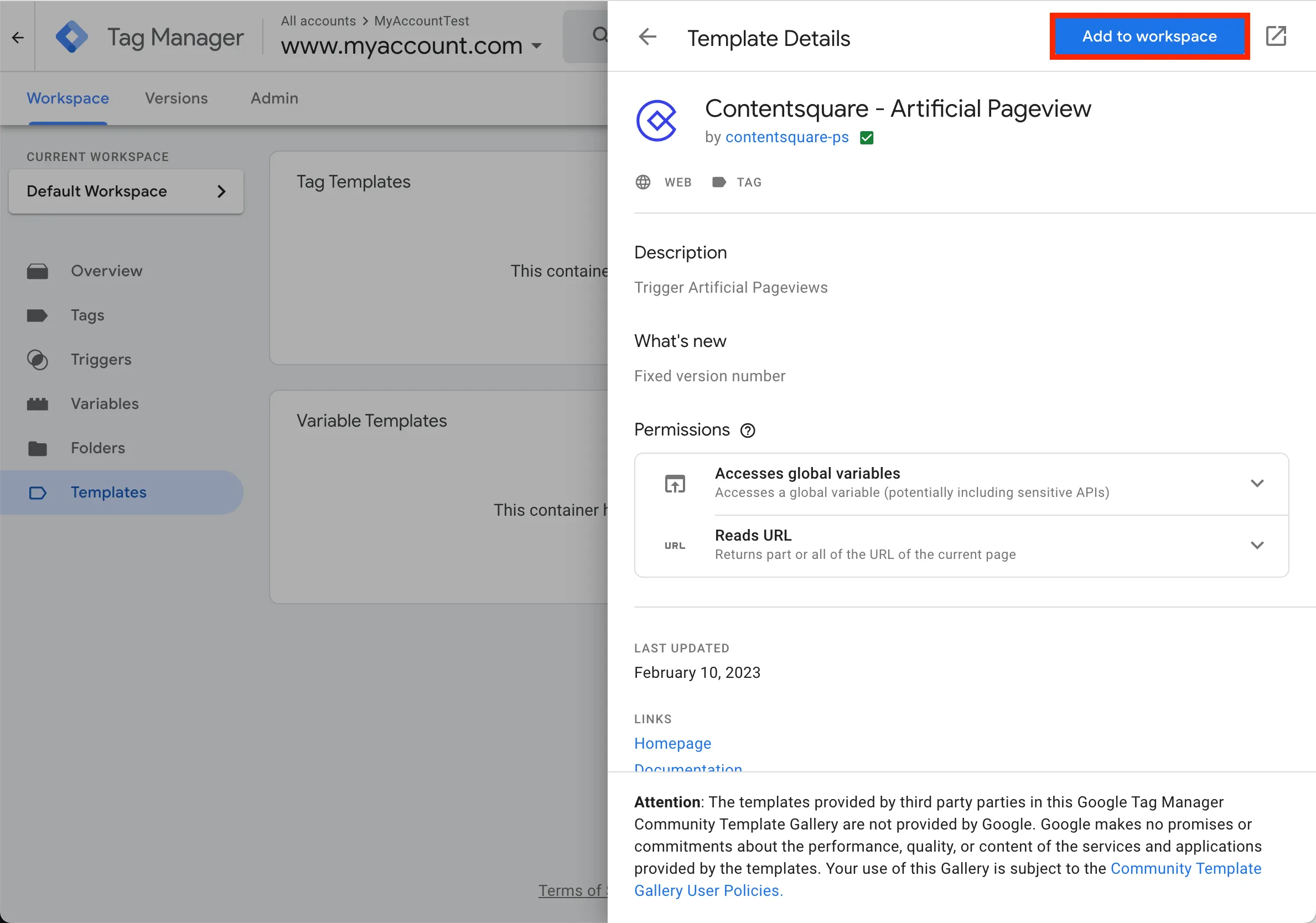 Cliquez sur Add to workspace