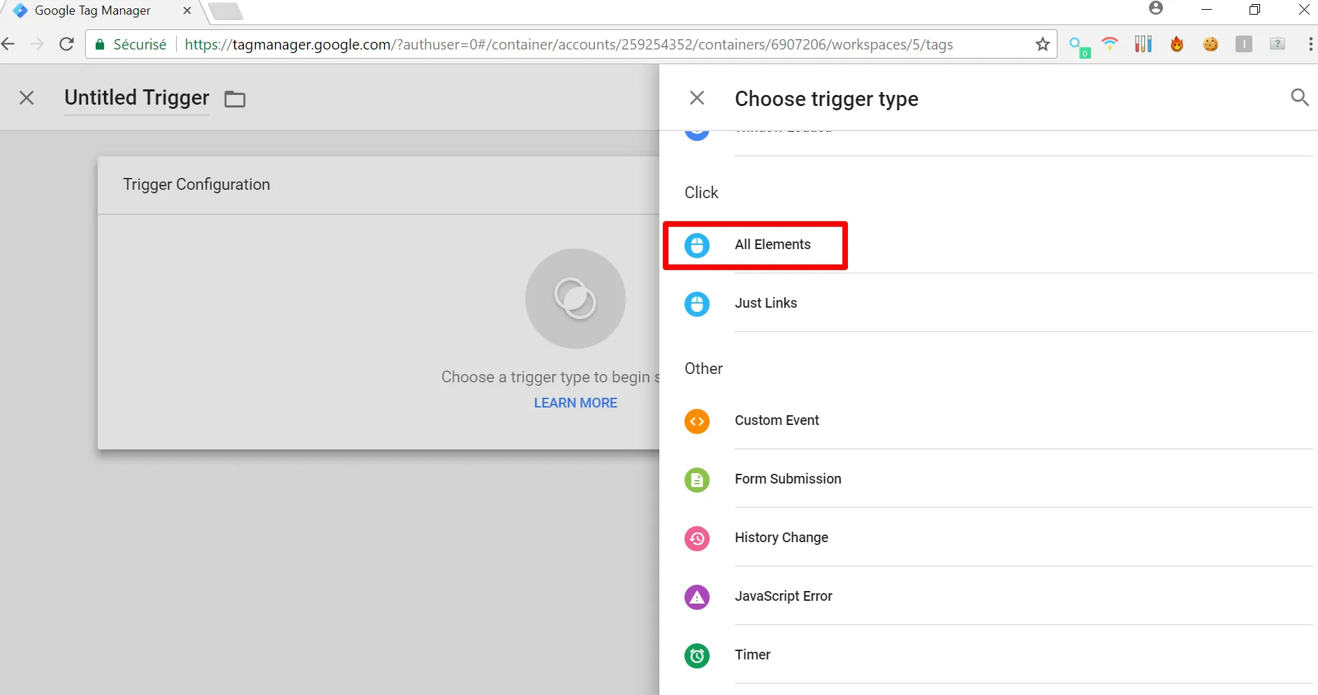 Dans la liste, sélectionnez le déclencheur “Tous les éléments”.