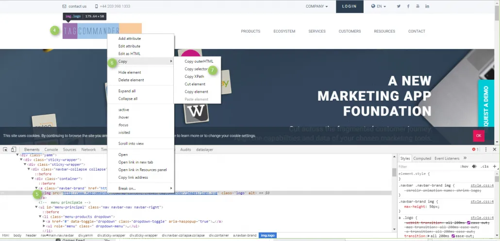 window._uxa = window._uxa || [];window._uxa.push(['trackPageview', <PATH_A_ENVOYER> ]);(4) allez sur votre site web; Placez le curseur sur l’élément sur lequel vous souhaitez placer un événement et faites un clic droit. Dans le menu qui s’ouvre, sélectionnez «Inspecter l’élément». (5) Dans la console, une fois l’élément mis en surbrillance, cliquez à nouveau avec le bouton droit de la souris. (6) Choisissez «copier» dans le menu. (7) «Sélecteur de copie».