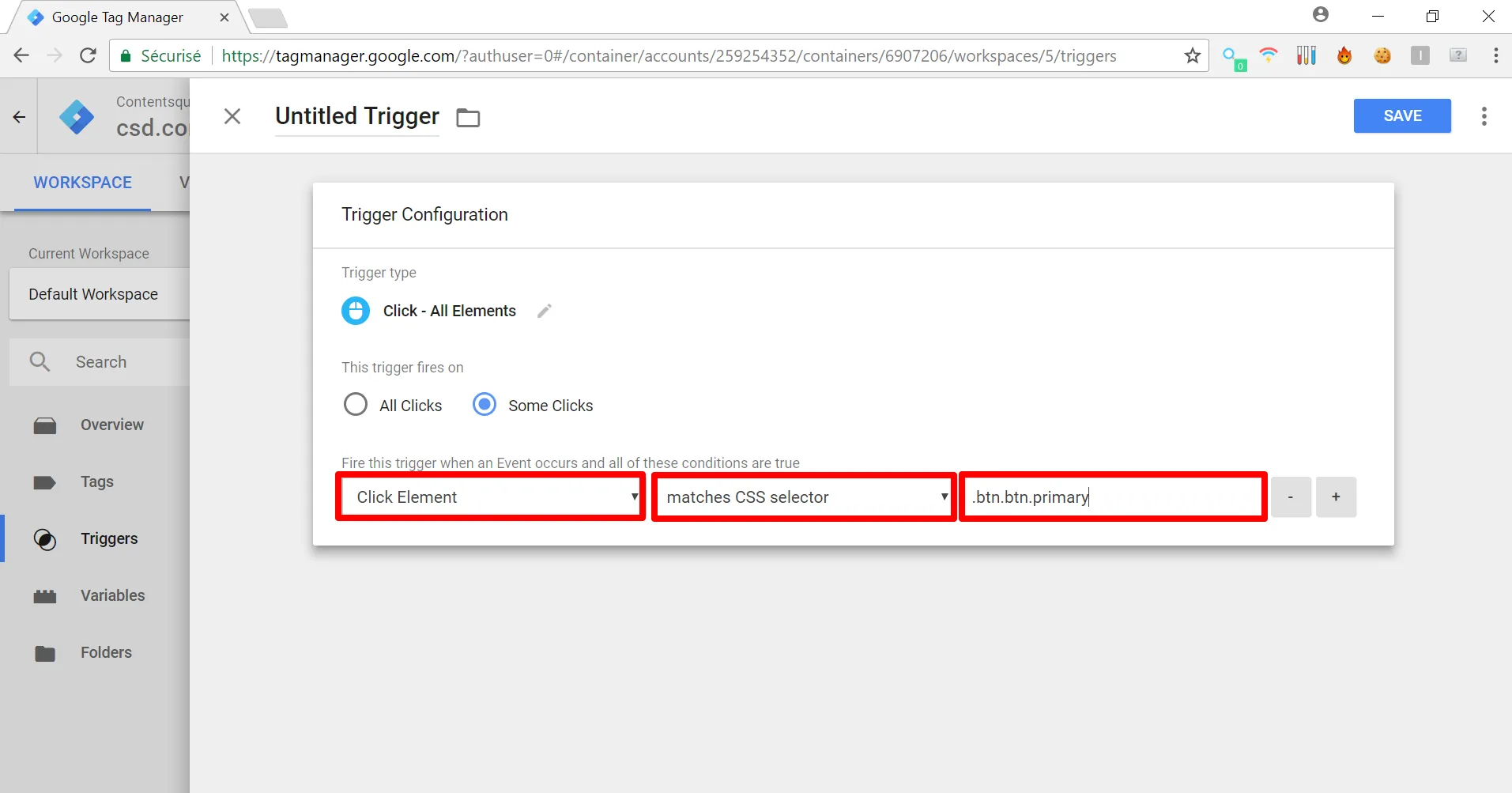Sélectionnez “Elément de clic”, “correspond au sélecteur CSS” et entrez un filtre valide CSS correspondant à l’élément que vous souhaitez suivre.